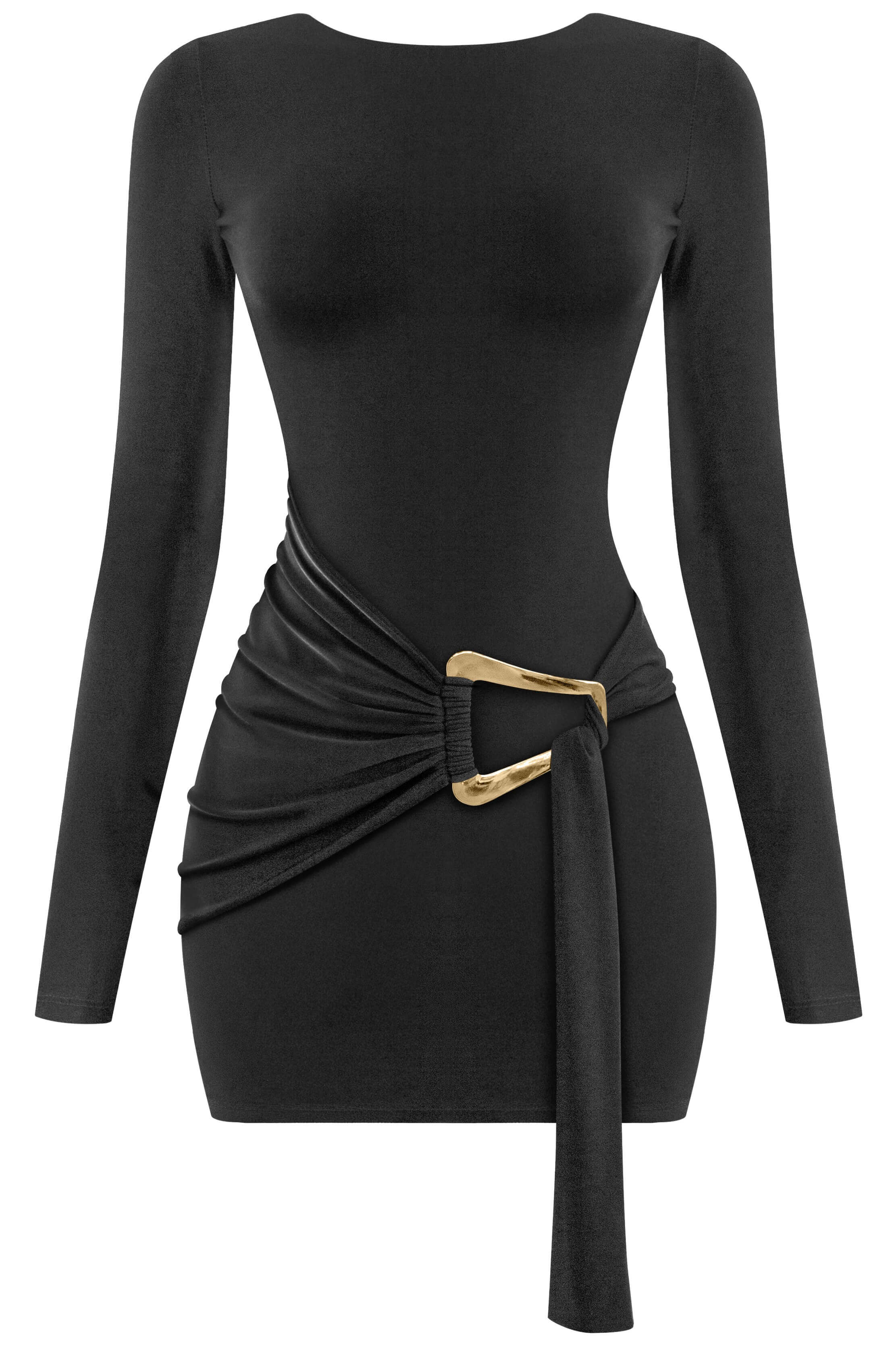 The Samantha Mini Dress combines elegance with modern edge. Crafted from stretchy, double-layered fabric, this piece hugs your curves while offering comfort and movement. Long sleeves provide coverage, while the open back creates an alluring focal point perfect for making a statement. Delicate silver trim detailing adds sophistication, and the graceful draping enhances your silhouette. At mini length, it's ideal for nights out or special occasions when you want to feel confident and stunning.