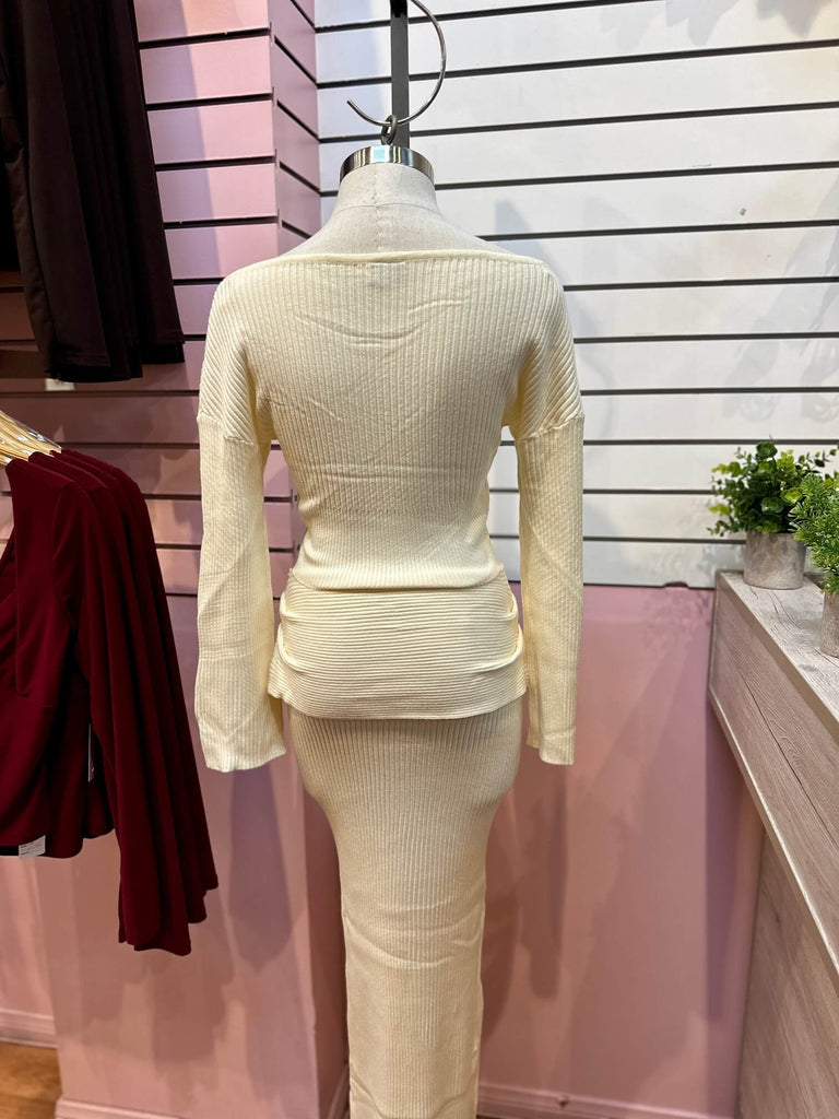 The Amanda Set brings effortless elegance to your wardrobe with its luxurious knitted ribbed construction. This versatile two-piece ensemble in creamy neutral tones offers endless styling possibilities—wear the pieces together for a coordinated look or mix and match with your existing basics. The ribbed knit fabric provides a flattering fit with gentle stretch and texture that elevates any casual outfit. Perfect for layering or wearing separately, this set delivers timeless style and comfort you'll reach for again and again.