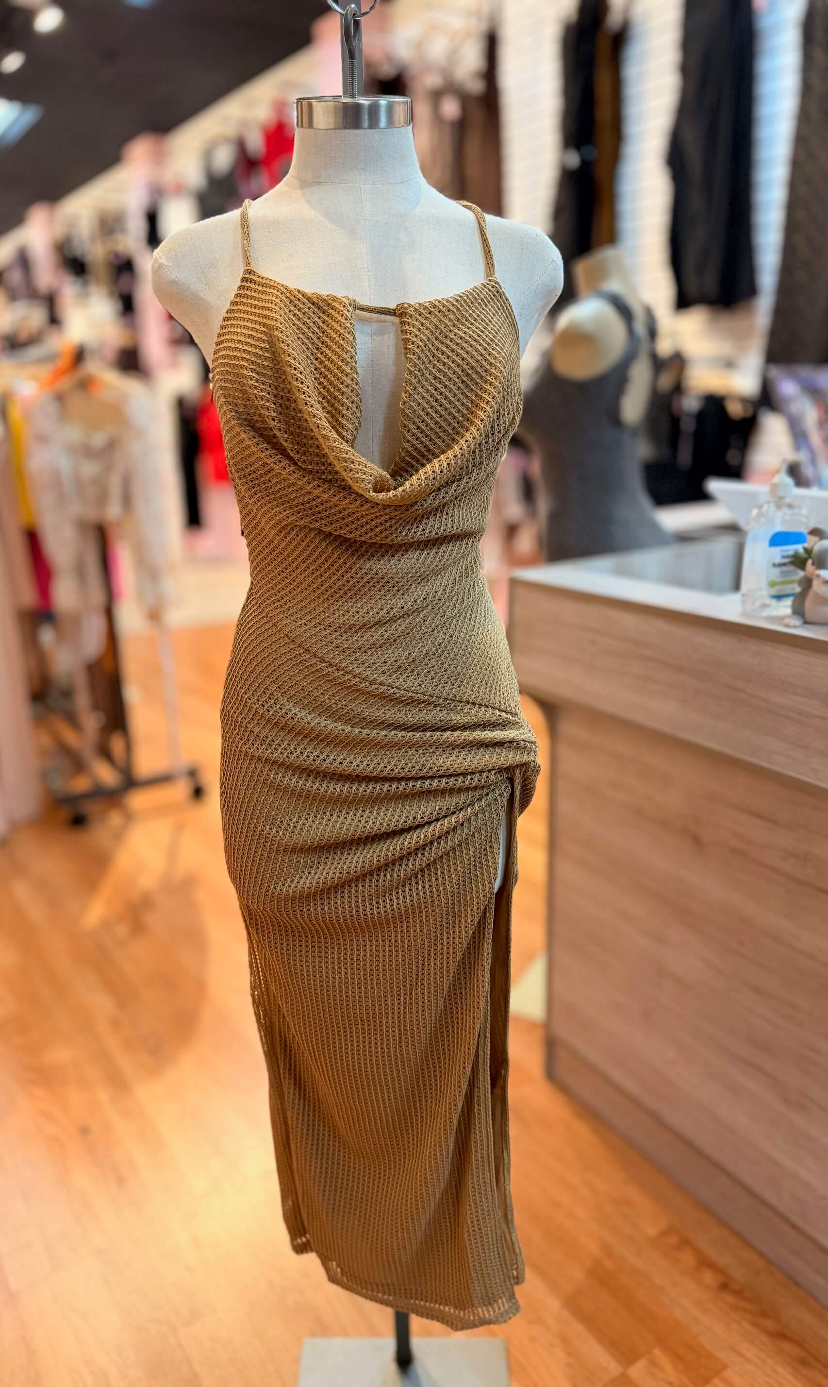 Make a stunning entrance in this captivating lime green midi dress. Designed for the modern woman, this dress features a flattering cowl neckline that drapes elegantly, complemented by a daring keyhole cutout for a touch of allure. The sleeveless halter neck design adds a sophisticated flair, perfect for warm-weather events. A dramatic high slit showcases your legs, while the intricate knot detail at the waist cinches your figure, creating a beautiful silhouette. Crafted from a textured fabric, this dress offers both comfort and style. It's the ideal choice for cocktail parties, evening gatherings, or any occasion where you want to feel glamorous and confident. Pair it with strappy heels and statement jewelry to complete your unforgettable look. This dress is a true embodiment of contemporary fashion and timeless elegance.