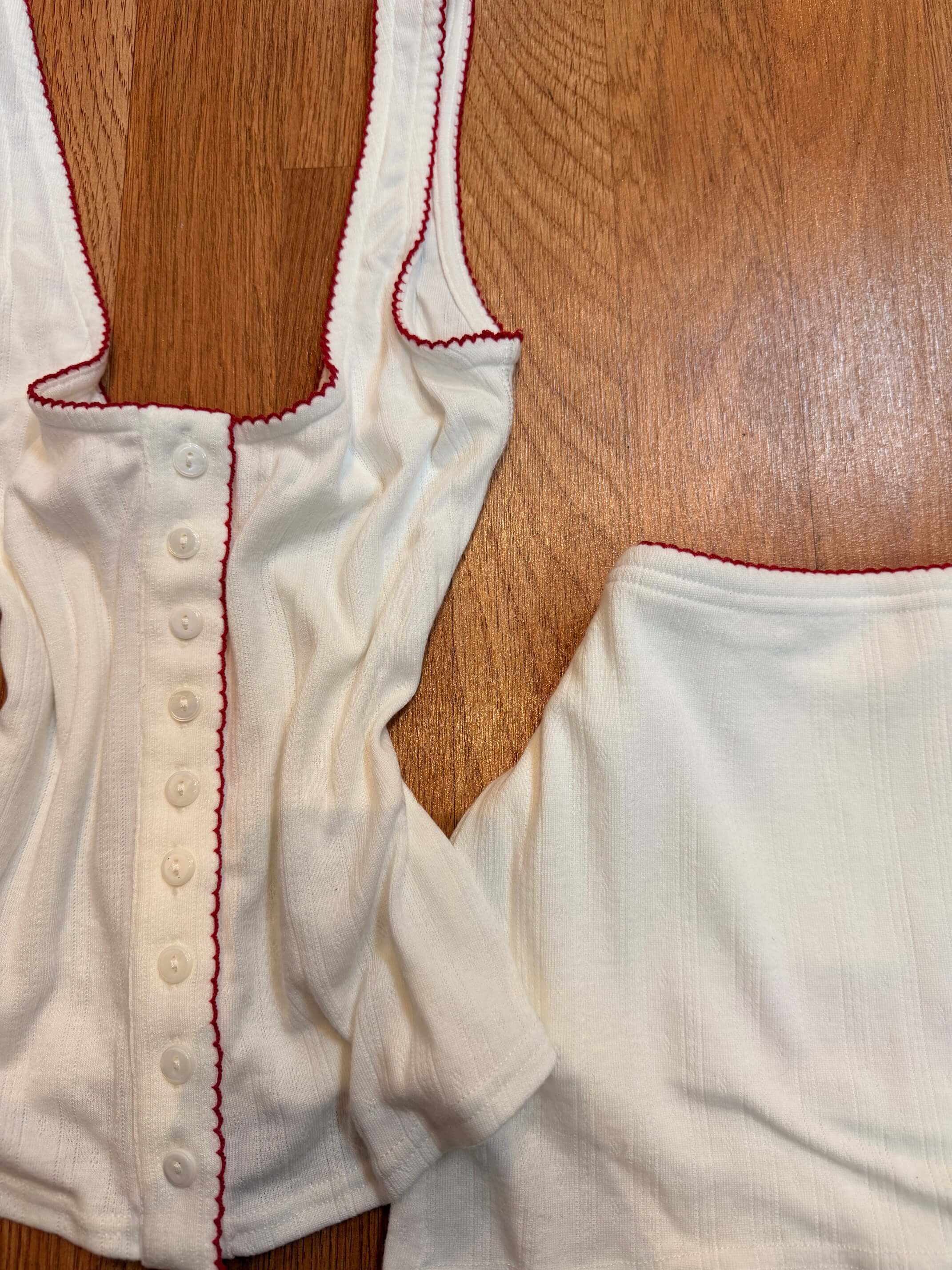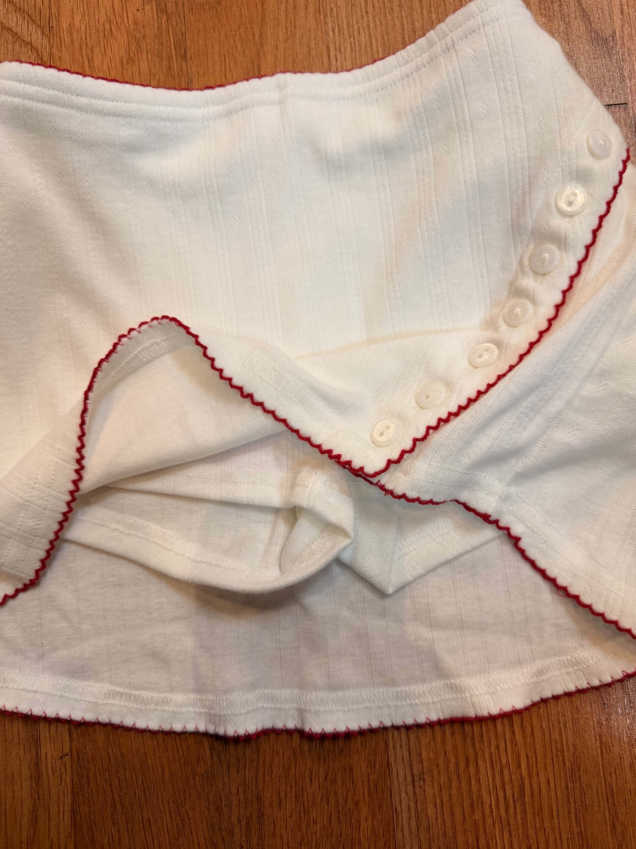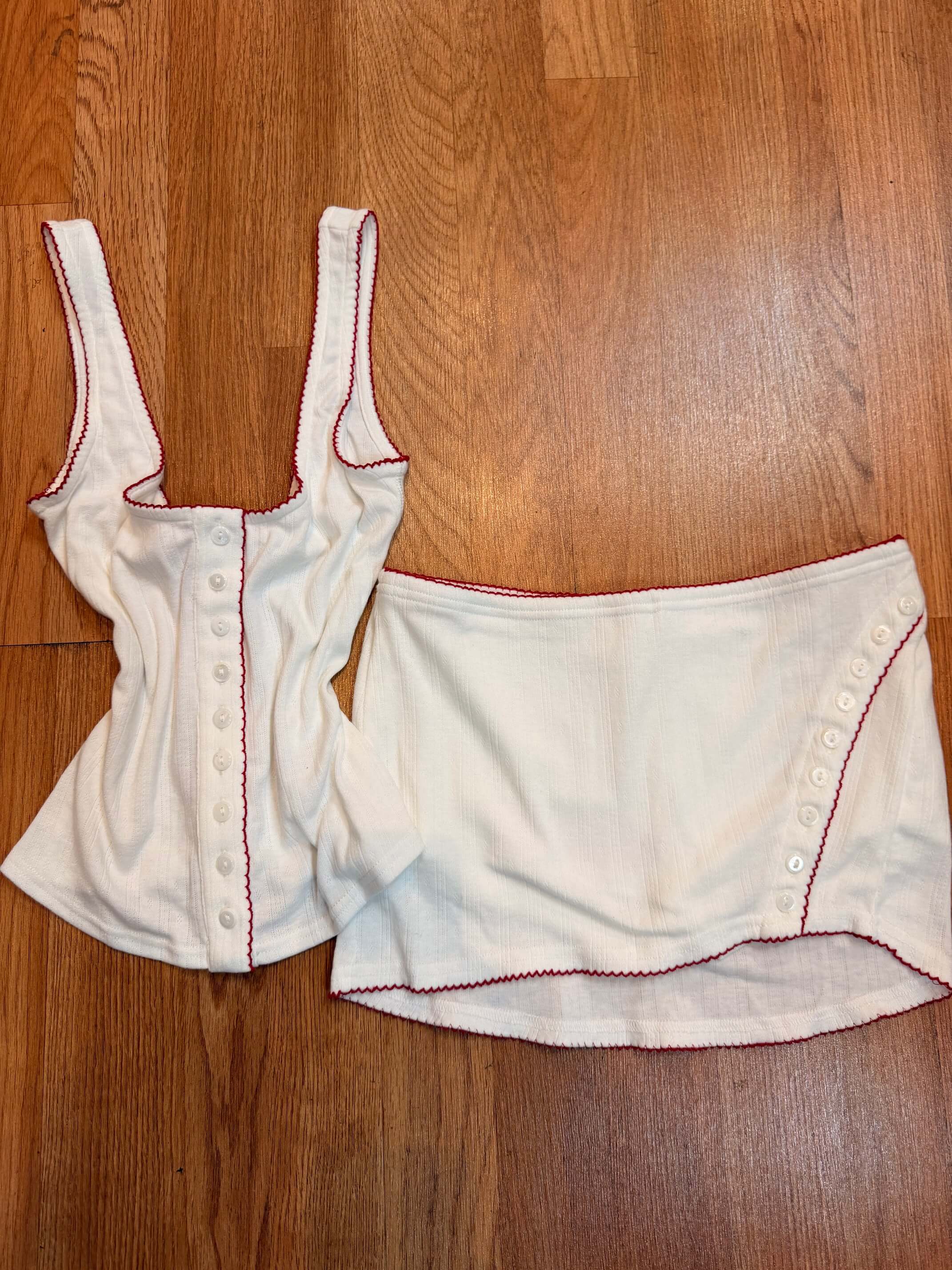 This two-piece set combines style and practicality with a coordinated look. The skirt features built-in shorts underneath for comfort and coverage, while striking red stitching details add a bold accent throughout. Perfect for a put-together ensemble that works for casual outings or dressed-up occasions.