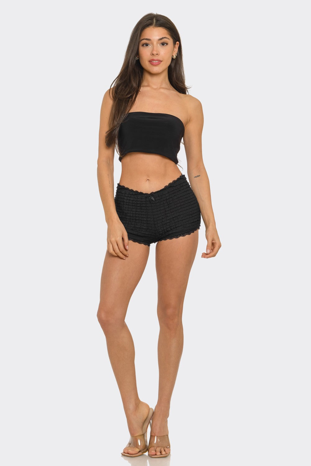 Elevate your wardrobe with the Meri Mini Ruffle Shorts, featuring delicate ruffled detailing that adds playful charm to any outfit. Perfect for warm weather styling, these shorts offer a flattering fit with a modern twist on a classic silhouette. Pair them with your favorite crop top or oversized tee for effortless, on-trend looks that transition seamlessly from day to night.