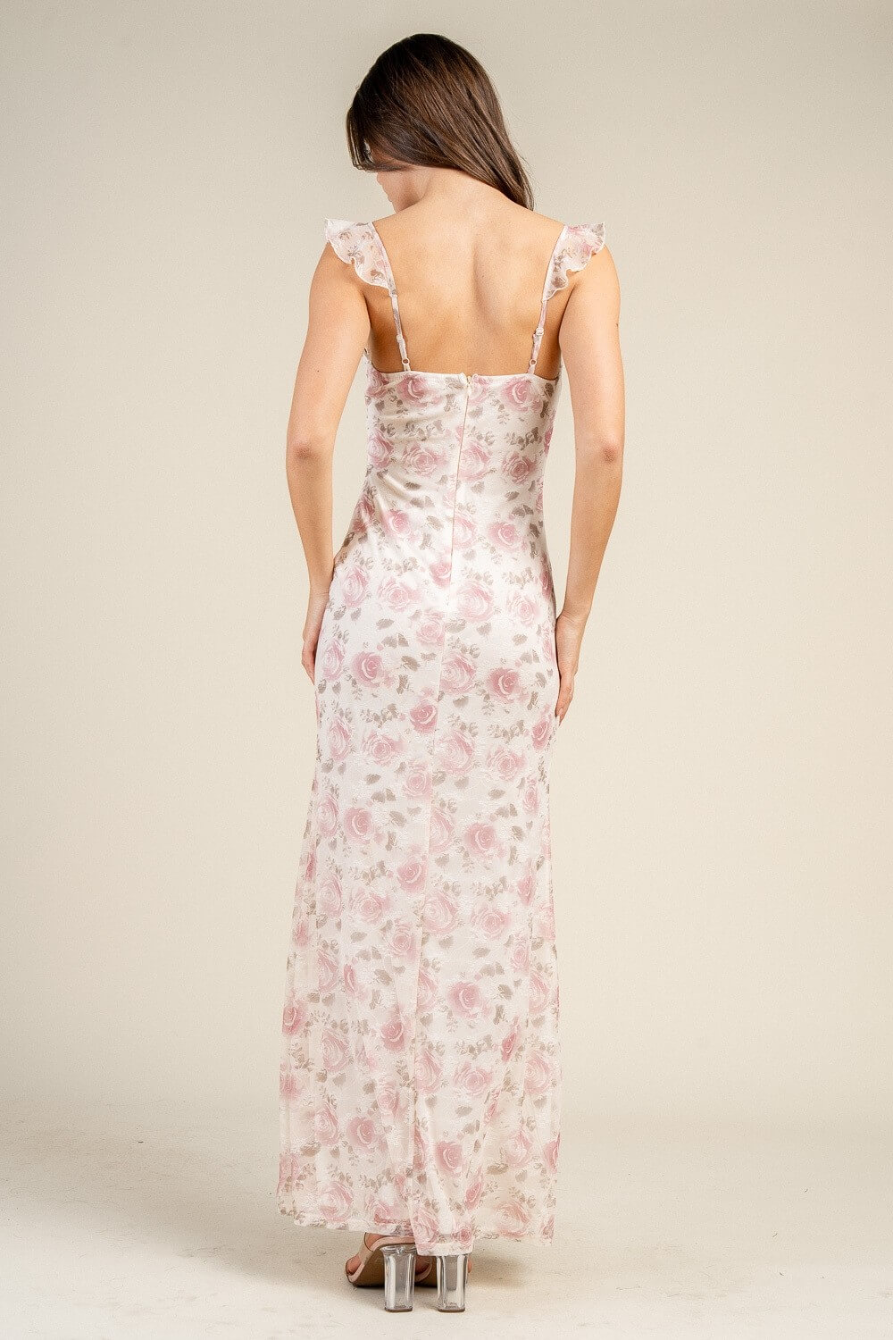 MERMAID ANKLE-LENGTH DRESS WITH CIRCULAR SHOULDER RUFFLE DETAIL