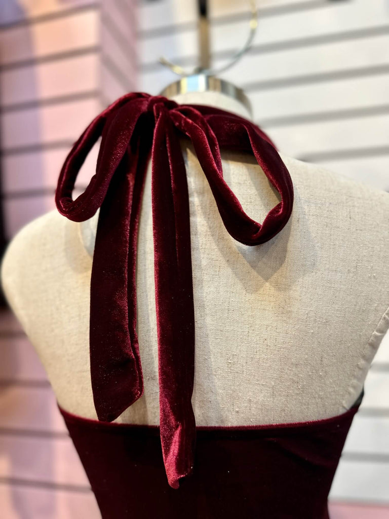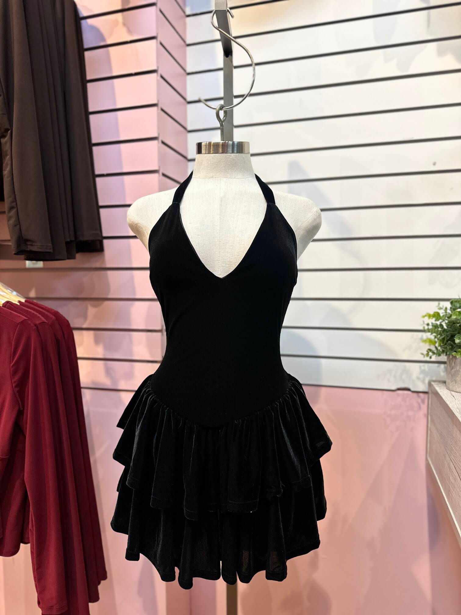 Slip into effortless elegance with the Velvet Babe Mini. This luxurious fit-and-flare dress features a flattering V-neckline and adjustable halter drawstring for a customized silhouette. The standout double-layer ruffle skirt adds romantic movement and dimension, creating an instantly eye-catching look. Perfect for nights out or special occasions, this velvet mini combines comfort with undeniable style—a wardrobe essential that makes you feel as good as you look.