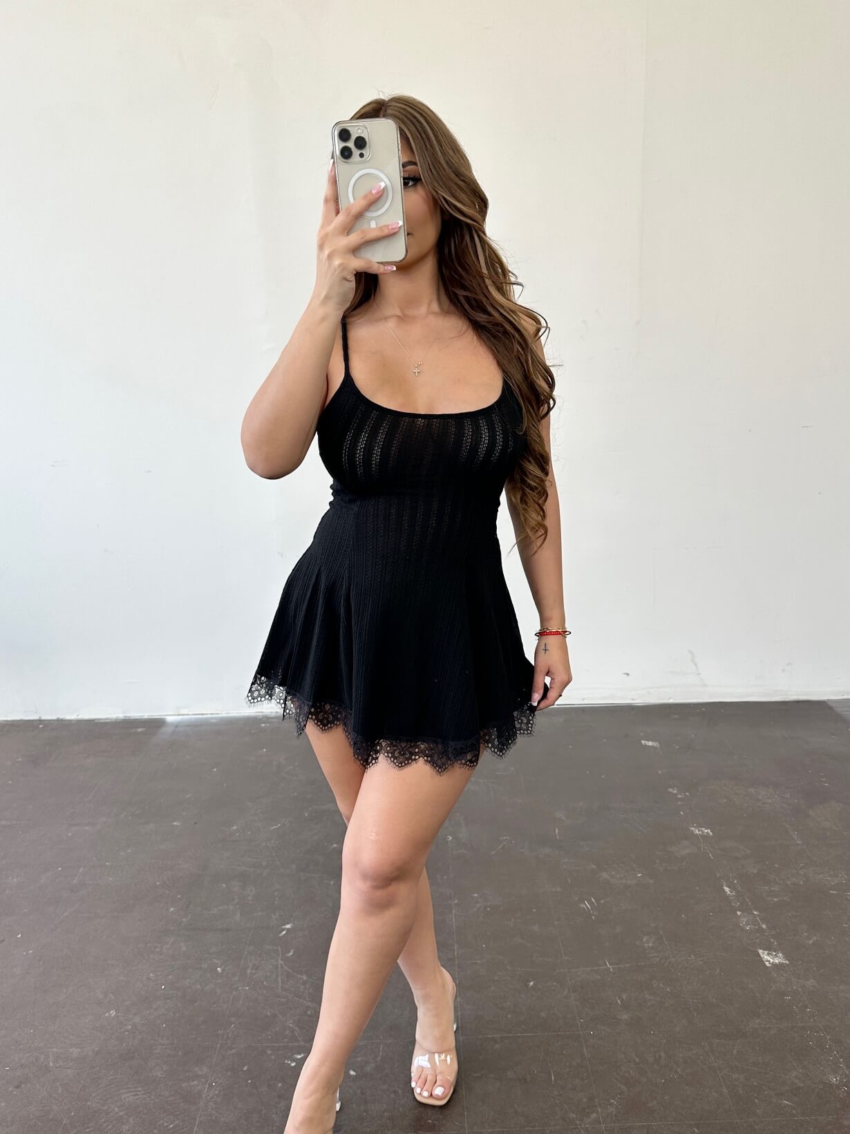 Effortlessly charming, this mini dress combines a flowy silhouette with delicate lace detailing for an enchanting look. Perfect for casual outings or special occasions, the lightweight fabric moves beautifully with you while the intricate lace adds a touch of elegance. A versatile piece that transitions seamlessly from day to night, this dress is designed to become a beloved staple in your wardrobe.
